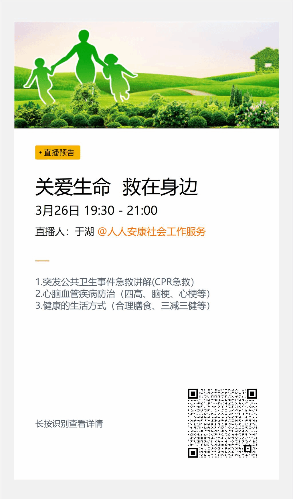 为引导广大教职工树立正确健康观,形成自律自主的健康生活方式,预防常见病及慢性病的发生,减少意外事故因抢救不及时造成的人员伤亡,校工会(妇委会)、后勤管理处特组织开展以“健康中国·我行动”为主题的公益宣教活动,望各基层工会积极组织职工观看。
