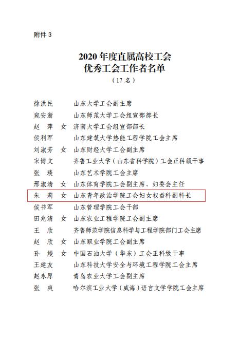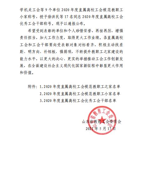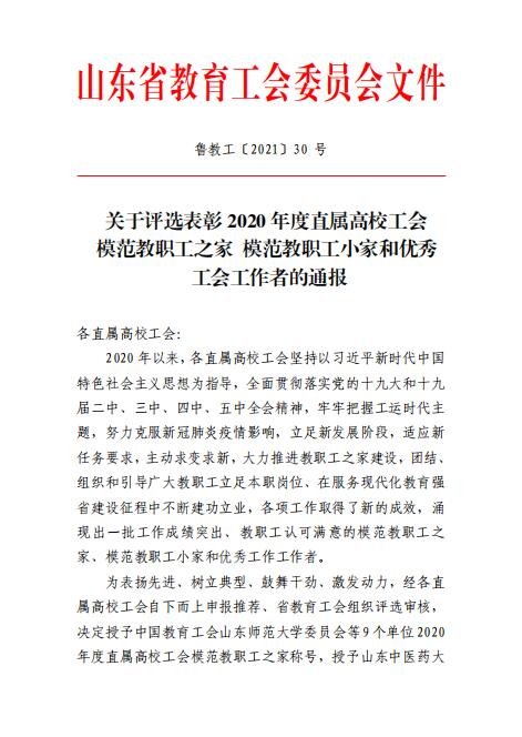 近日,山东省教育工会委员会发布了《关于评选表彰2020年度直属高校工会模范教职工之家 模范教职工小家和优秀工会工作者的通报》,我校舞蹈学院分工会荣获“2020年度直属高校工会模范教职工小家”荣誉称号,朱莉同志荣获“2020年度直属高校工会优秀工会干部”称号。