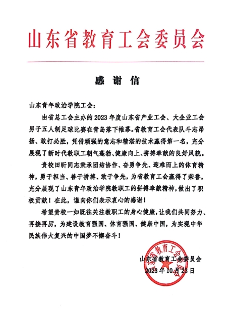 10月23日,山东省教育工会向学校工会发来感谢信,对我校体育部田昕同志在2023年度山东省产业工会、大企业工会男子五人制足球比赛中展现出的团结协助、奋勇争先、迎难而上的体育精神给予高度赞扬,对我校教职工做出的积极贡献表示衷心的感谢。